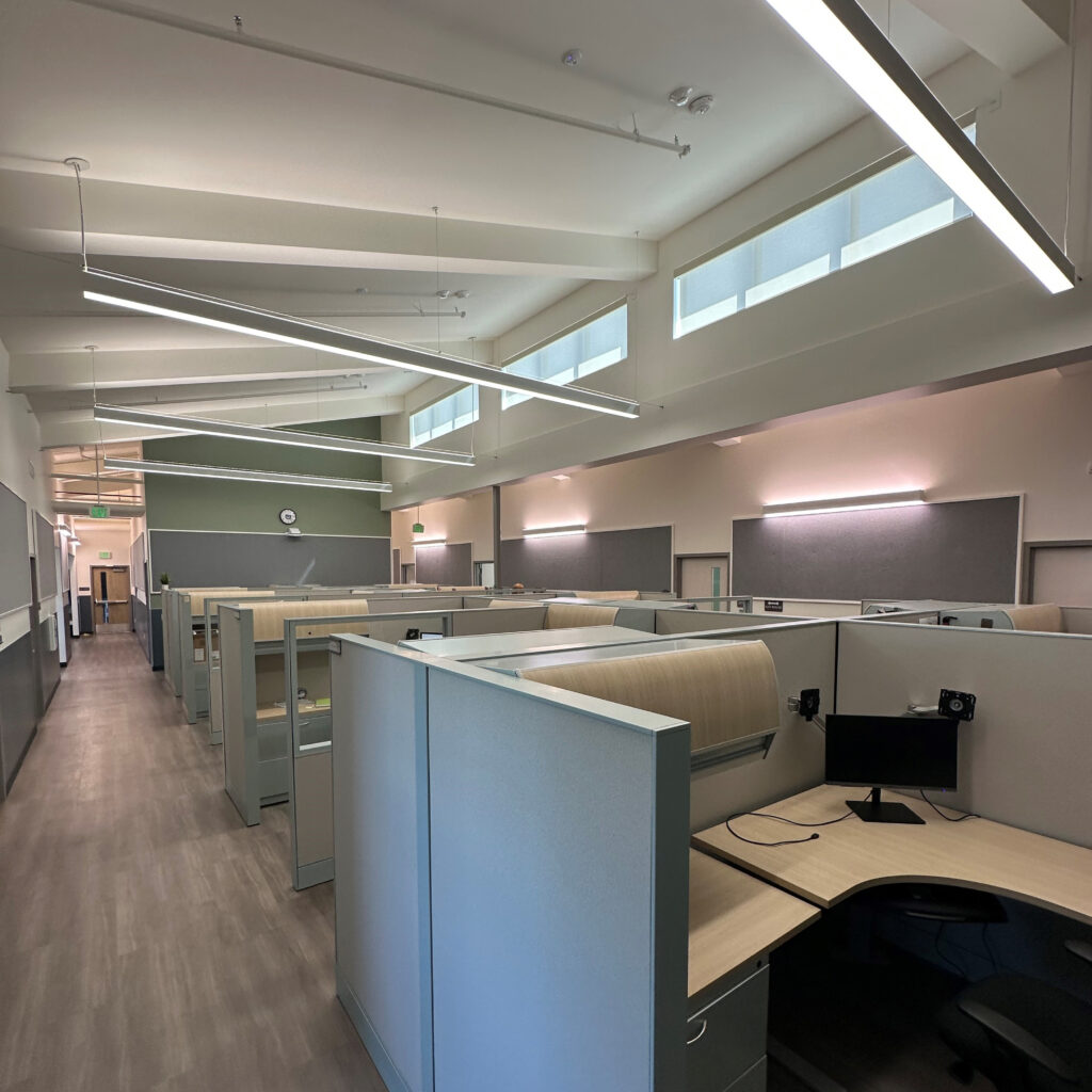 Clerestory windows and open office planning fill the interior with natural light, creating a bright, airy, and collaborative work environment at the heart of the district office.